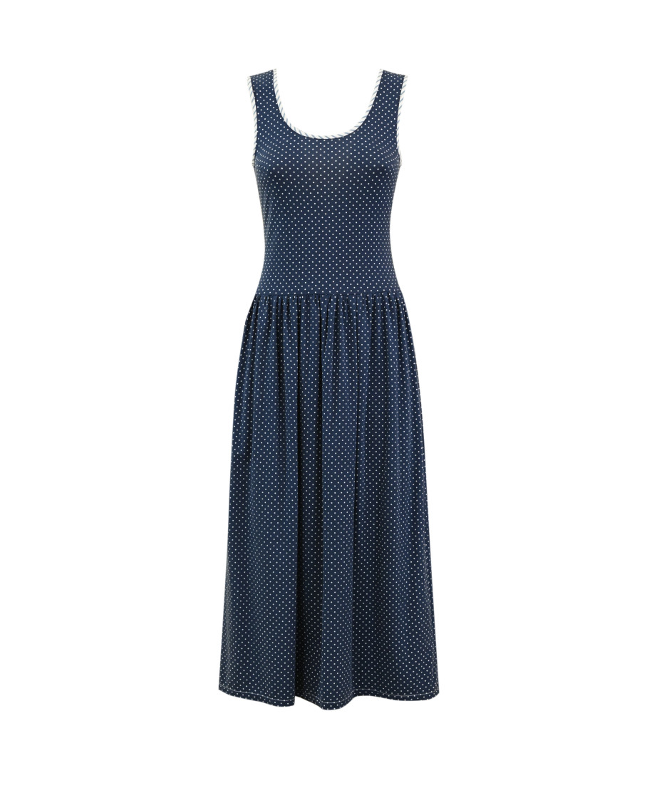 La stampa a pois bianchi su fondo blu navy dona un tocco retrò e romantico, rendendolo adatto sia per il giorno che per occasioni casual-chic. La gonna a pieghe morbide conferisce volume e leggerezza, enfatizzando lo stile fresco e versatile del capo.