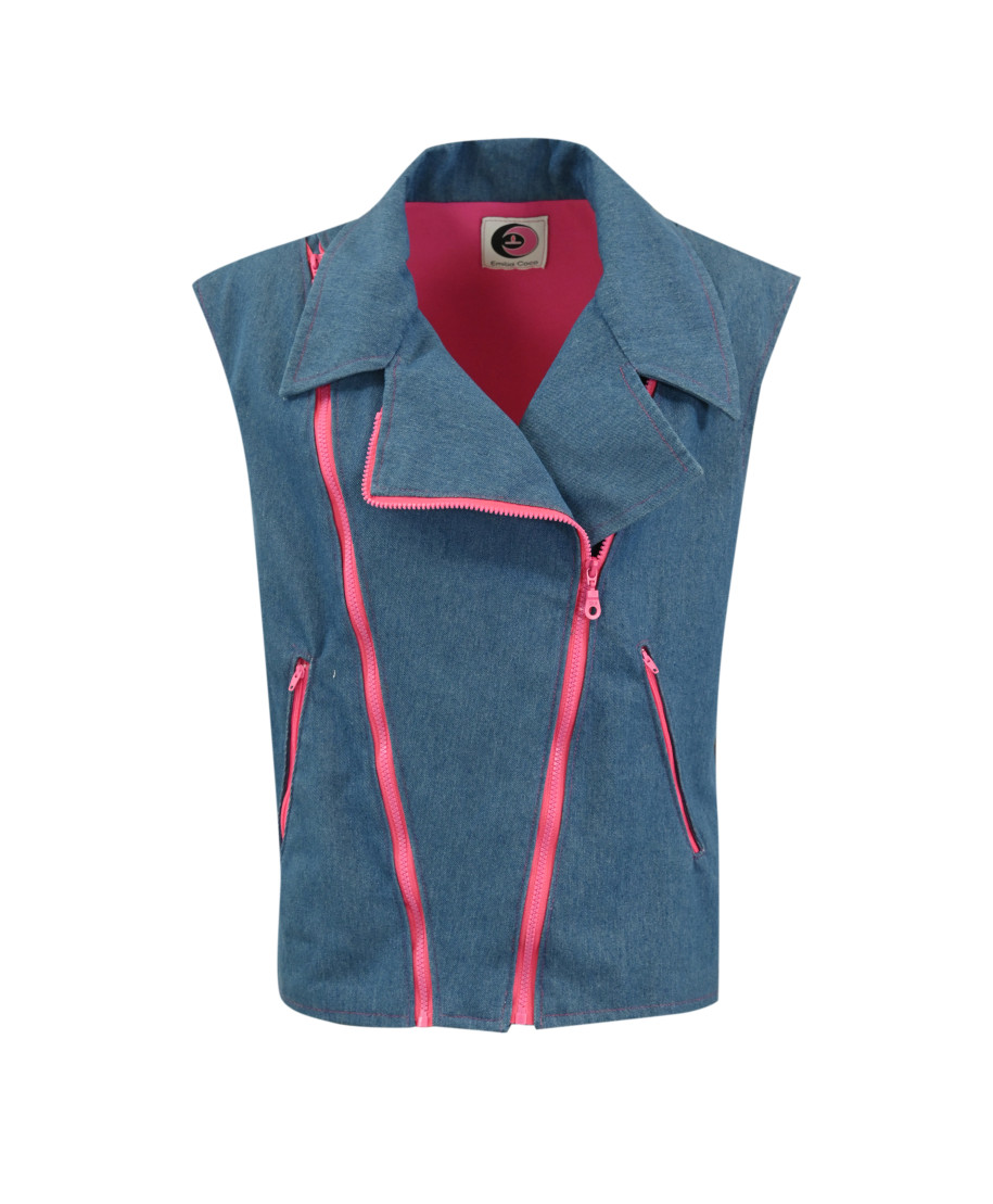 Gilet dallo stile biker senza maniche, realizzato in denim morbido ma strutturato, con interno in felpa garzata fucsia a contrasto che dona comfort e calore. Il collo ampio a rever richiama il classico chiodo, mentre la chiusura obliqua con zip fucsia e le due tasche verticali con zip coordinate esaltano l’estetica grintosa e contemporanea del capo.