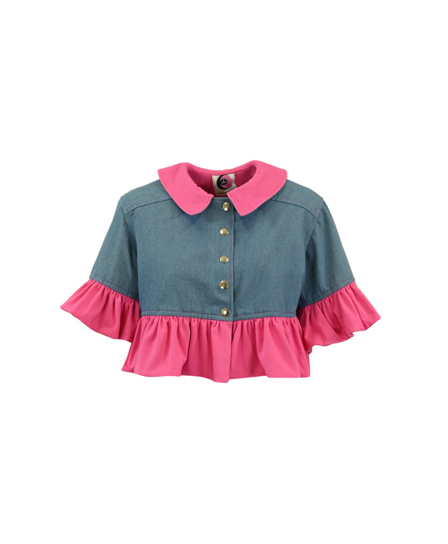 Giacca corta in denim con abbottonatura centrale e voilant sulle maniche e in vita.