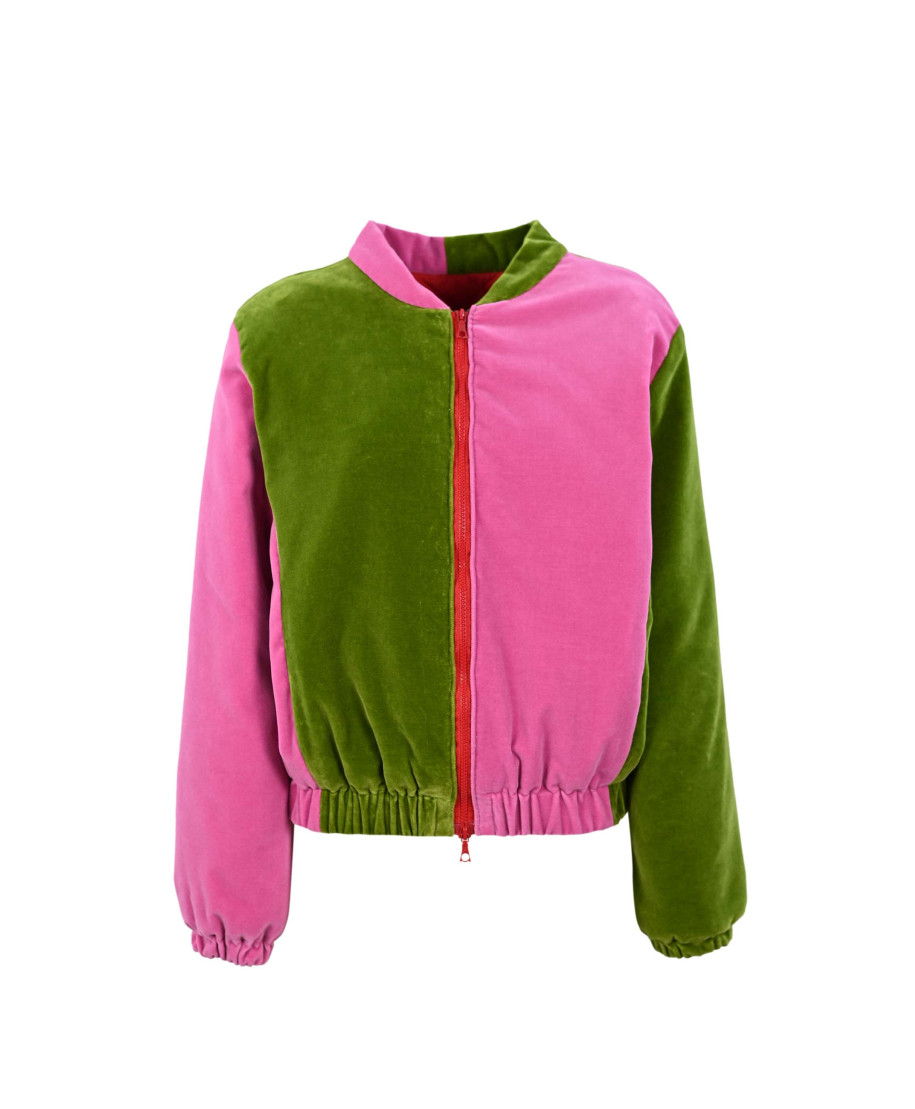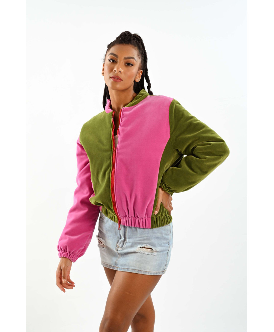 Bomber bicolore in velluto con cerniera, elastico in vita e ai polsi.