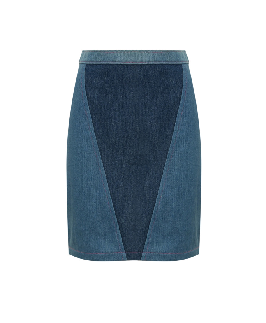 Gonna midi bicolore in denim con zip posteriore.