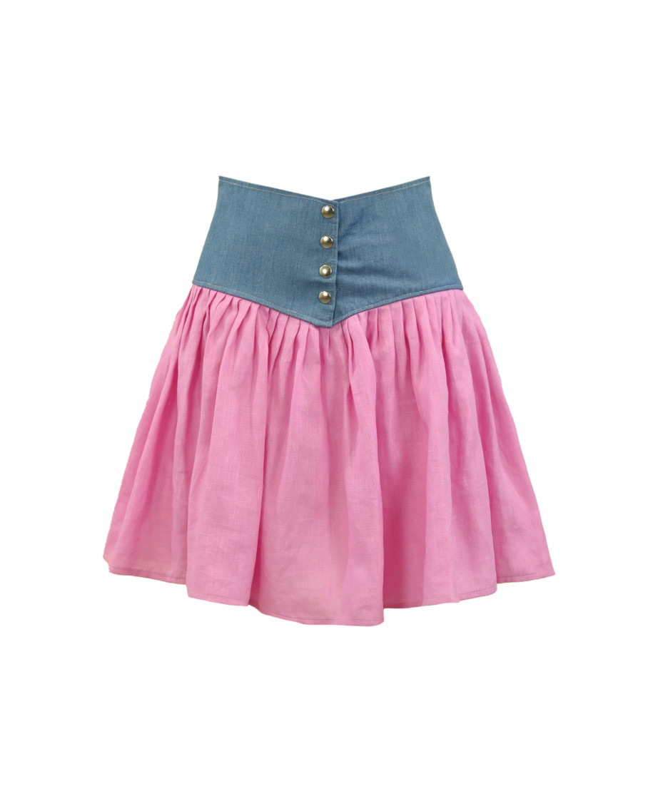 Gonna in misto lino rosa con fascia in denim e abottonatura centrale.