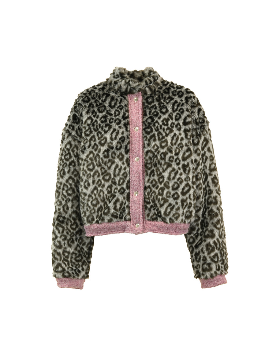 Pelliccia corta in eco-fur animalier ,con stampa leopardata nei toni del grigio e nero. Il modello ha una vestibilità morbida e lineare, con chiusura centrale a bottoni a pressione. Il capo è rifinito con dettagli in tessuto bouclé rosa antico su colletto, polsini, bordo frontale e fondo, creando un elegante contrasto cromatico. Un capo audace e glamour, perfetto per dare carattere anche agli outfit più semplici.