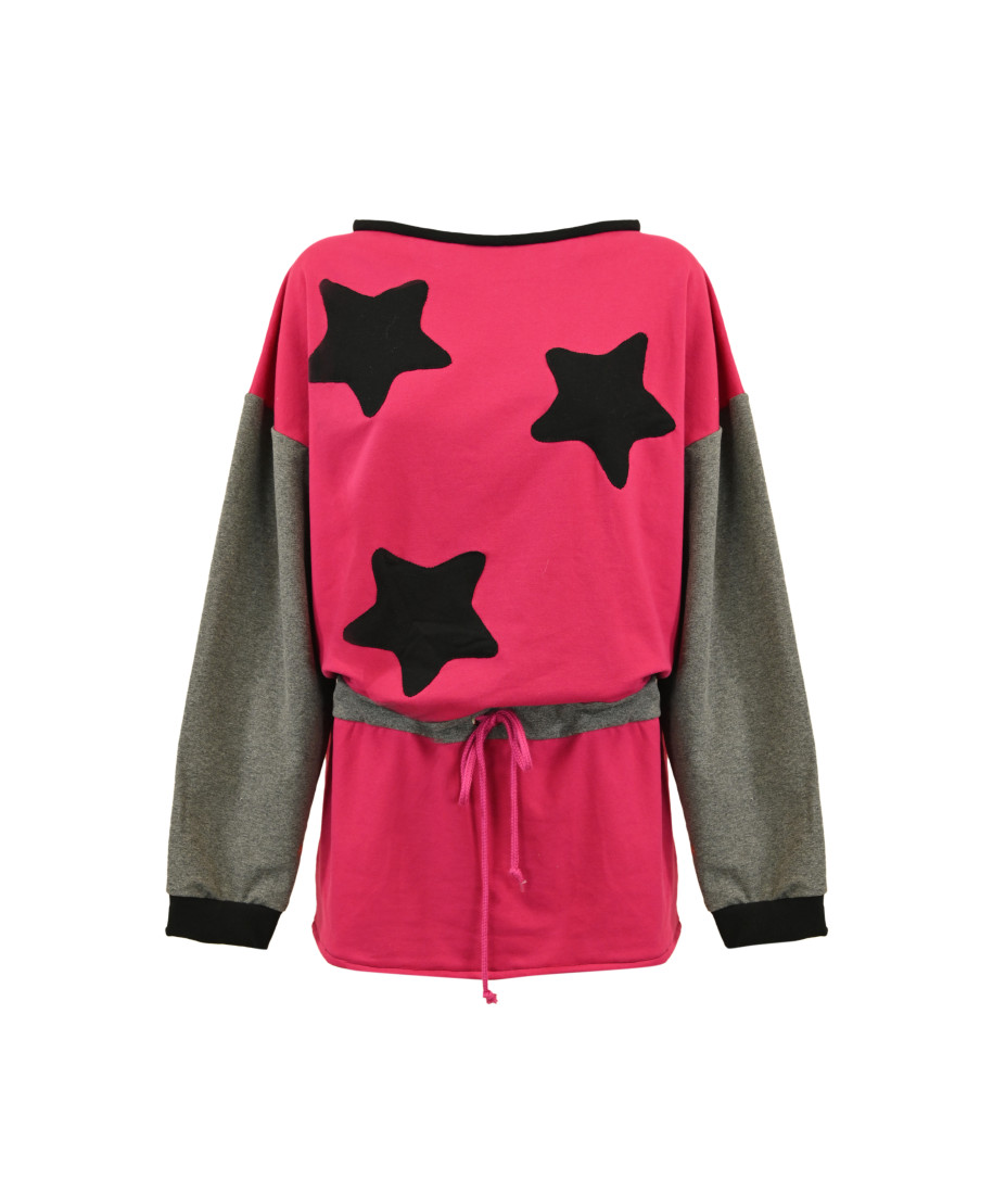 Abito felpa bicolore con stelle applicate;comodo e originale, questo abito in stile felpa è perfetto per chi ama un look casual ma ricercato. Realizzato in morbido cotone, presenta un vivace corpo fucsia con maxi stelle nere applicate sul davanti con cuciture a zig zag, maniche grigio melange a contrasto e polsini neri. La coulisse in vita, con laccetto regolabile, valorizza la silhouette donando una vestibilità versatile. Un capo che unisce comfort e creatività, ideale per chi vuole distinguersi con personalità.