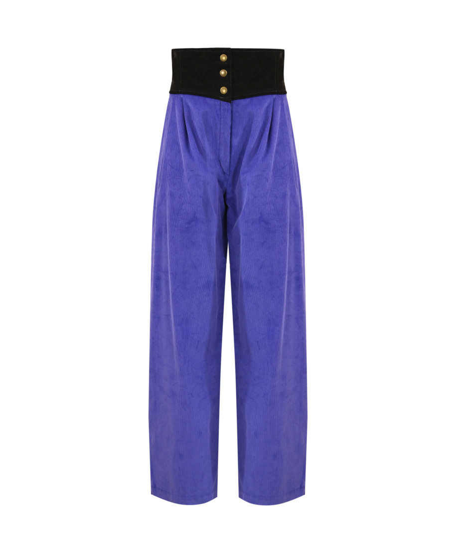 Pantalone bicolore a vita alta in velluto a coste strette Visconti di Modrone . Il modello presenta una silhouette ampia e dritta, ispirata allo stile anni ’80, con pinces anteriori che donano struttura e volume alla parte alta della gamba. In evidenza la cintura nera applicata in vita a contrasto, chiusa sul davanti da una fila di bottoni metallici dorati che aggiungono un tocco di carattere. La vestibilità comoda e il taglio deciso lo rendono perfetto per outfit dal gusto retro ma contemporaneo, abbinabile con capi coordinati o top più essenziali.