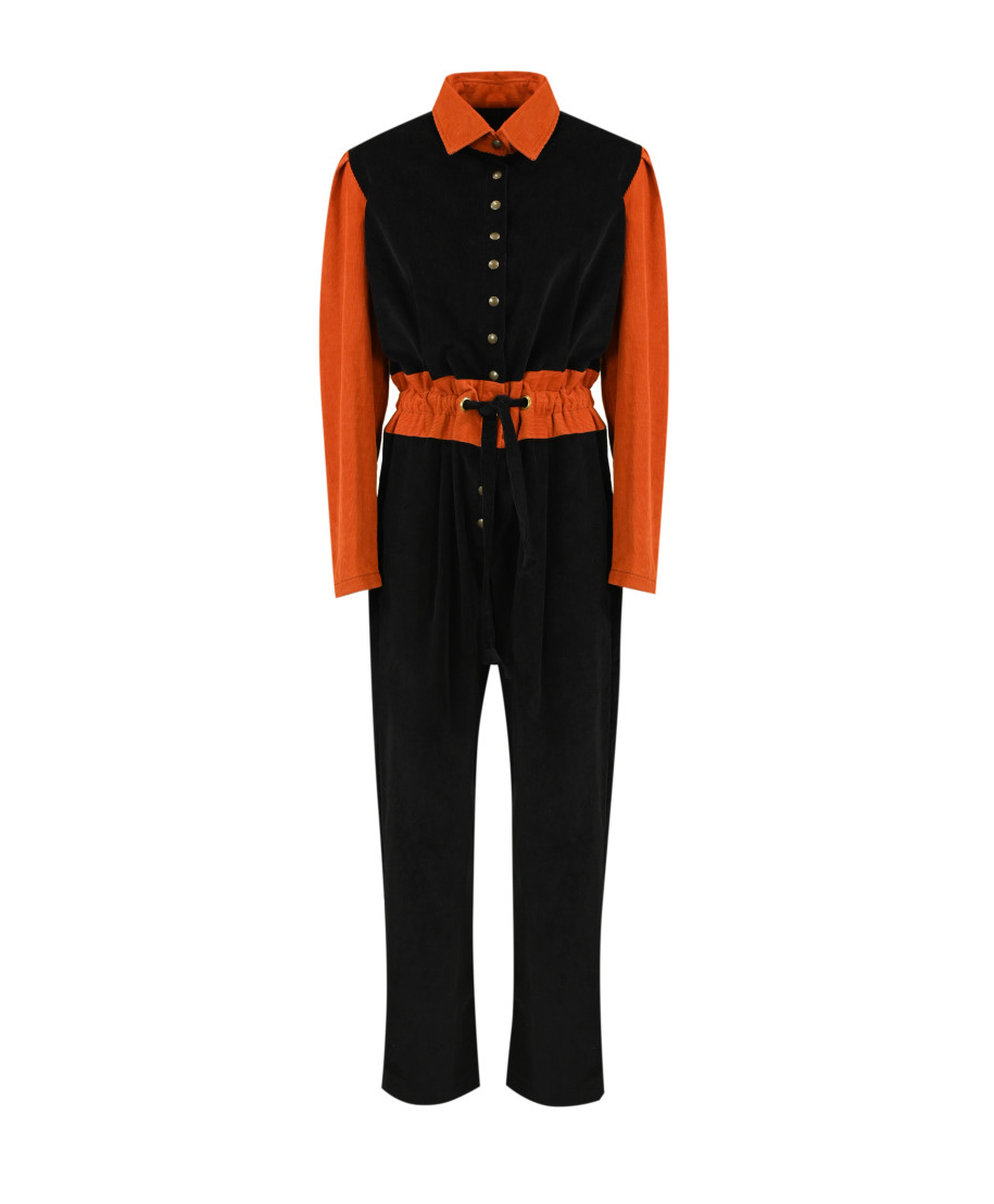 Jumpsuit bicolore in velluto a coste strette Visconti di Modrone, nei toni decisi del nero e dell’arancione bruciato, ispirata allo stile anni ’80. Le maniche a sbuffo arancioni presentano polsini con abbottonatura, mentre il corpetto nero è impreziosito da una chiusura centrale con bottoni metallici dorati. In vita, una fascia in velluto arancione con coulisse consente di arricciare e definire la silhouette, creando un effetto strutturato e femminile. Il pantalone, in velluto nero, ha linea dritta per un look grintoso, contemporaneo e dal gusto rétro.