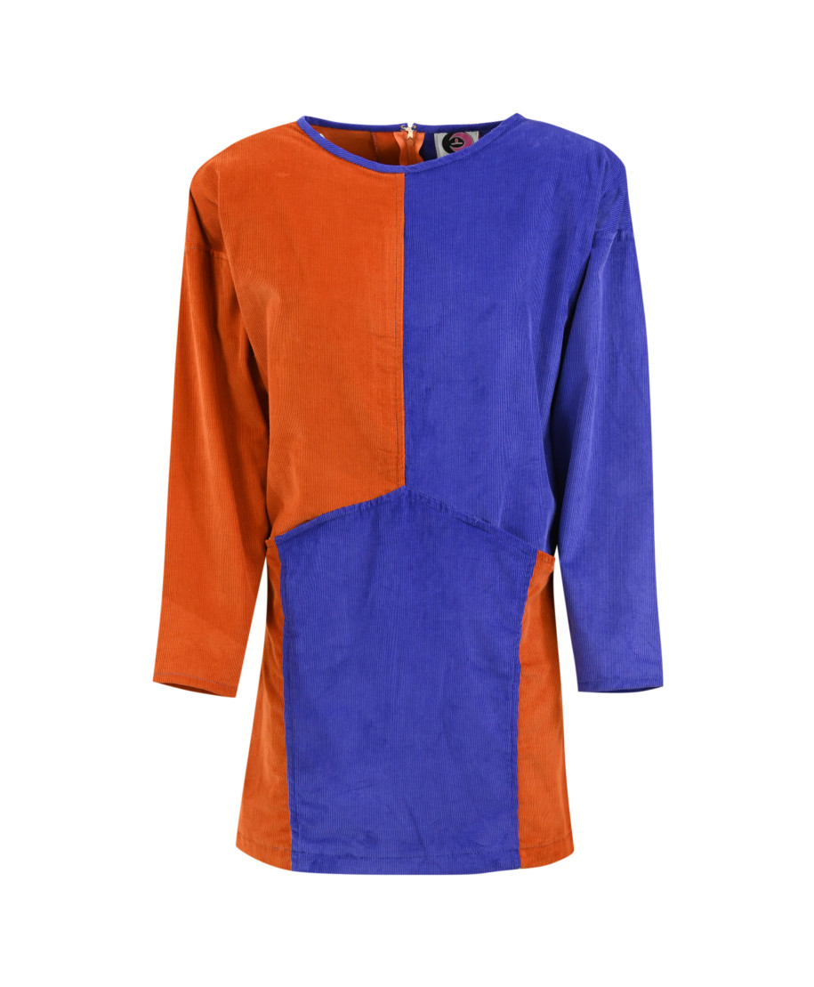 Abito corto bicolore in velluto a coste strette Visconti di Modrone, nei toni decisi del viola e dell’arancione, ispirato allo stile anni ’80. La silhouette presenta spalle strutturate con spalline e maniche lunghe, richiamando le proporzioni iconiche di quel decennio. Il design è caratterizzato da un originale gioco di blocchi cromatici verticali e diagonali che slanciano la figura, con tasche laterali tono su tono che donano all’abito un tocco sportivo e pratico. Lo scollo è rotondo, essenziale, mentre sul retro è presente una cerniera nascosta per la chiusura. Un capo d’impatto, dinamico e contemporaneo, che fonde volumi retrò e funzionalità moderna.