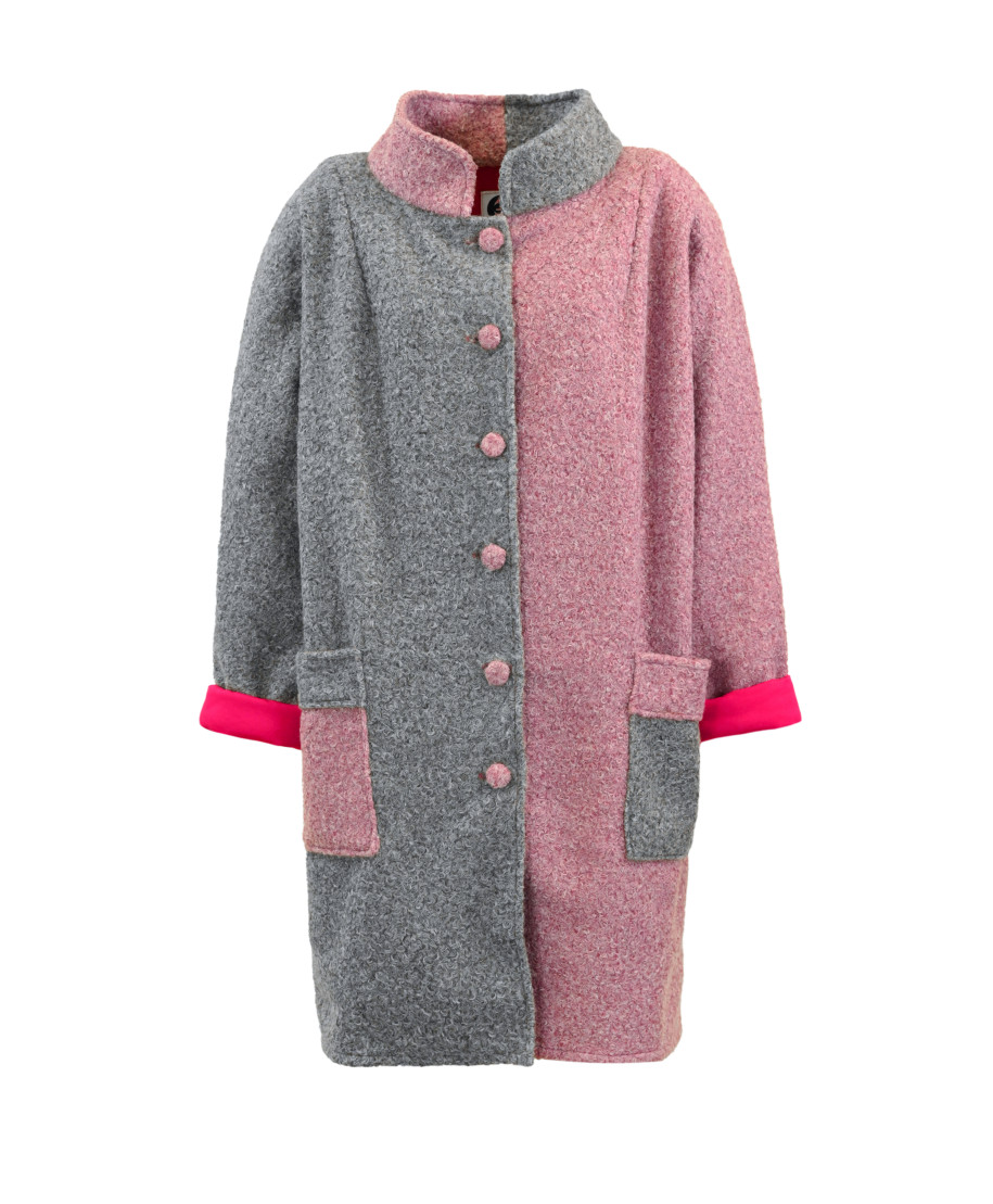 Cappotto oversize d’ispirazione anni '80 ,con spalline imbottite che definiscono una silhouette strutturata ma morbida. Il design bicolore, con metà in grigio melange e metà in rosa malva , è arricchito da bottoni foderati tono su tono per un effetto raffinato e uniforme. I risvolti fucsia sulle maniche aggiungono un accento vivace. Comode tasche laterali inserite nei tagli. L’interno è rifinito con jersey punto roma fucsia , che garantisce comfort e un tocco contemporaneo. Un capo che mixa stile rétro e dettagli moderni con eleganza.