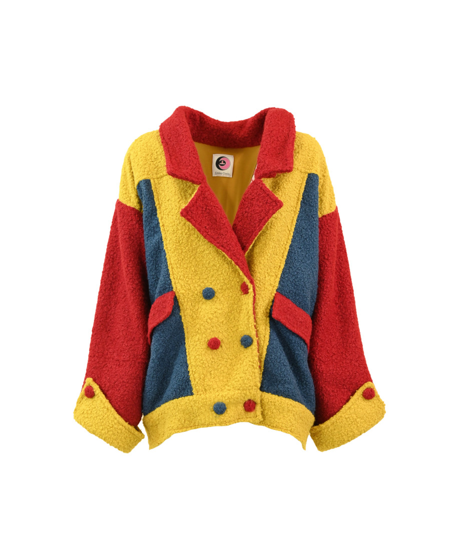 Giacca corta in bouclé, dallo stile deciso e giocoso. Il design color block combina con energia il giallo, il rosso e il blu, creando un effetto visivo d'impatto ispirato agli anni '80. Presenta una silhouette morbida e leggermente over, doppiopetto con bottoni rivestiti in tessuto tono su tono, rever classico e maniche lunghe con risvolto. Le tasche a filetto e i dettagli sartoriali aggiungono carattere e funzionalità.
