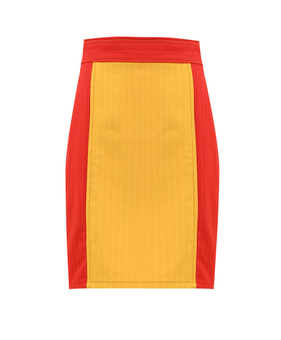 Gonna a tubino bicolore, realizzata in tessuto gessato di pura lana sinonimo di qualità e stile sartoriale. Il design aderente esalta con raffinatezza la silhouette femminile, donando un’allure decisa ma sofisticata.