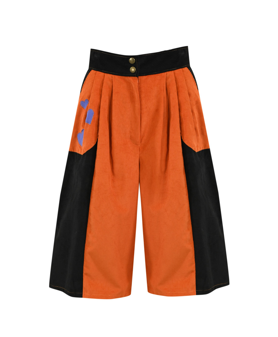 Bermuda in velluto a coste strette Duca Visconti di Modrone, dallo stile urban e deciso. Il modello bicolore, in arancione e nero, presenta una vestibilità ampia con pieghe frontali che valorizzano la forma. Dettaglio iconico: cuori in felpa applicati sul fianco con cuciture a zig zag, per un tocco creativo e artigianale. Completano il capo le tasche laterali, la chiusura centrale con doppio bottone e la cintura alta in contrasto.