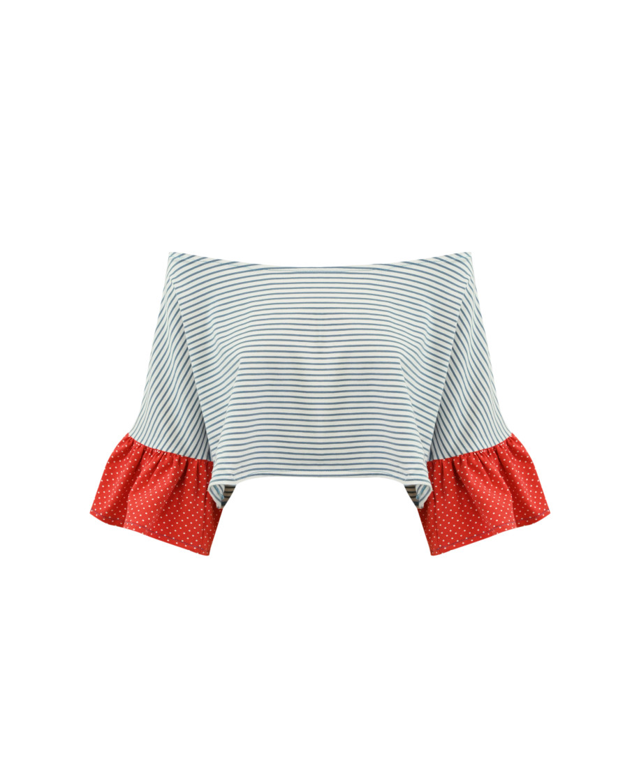 La particolarità del capo sono le maniche a volant in contrasto rosse a pois; un capo perfetto da indossare sui jeans o shorts leggeri.