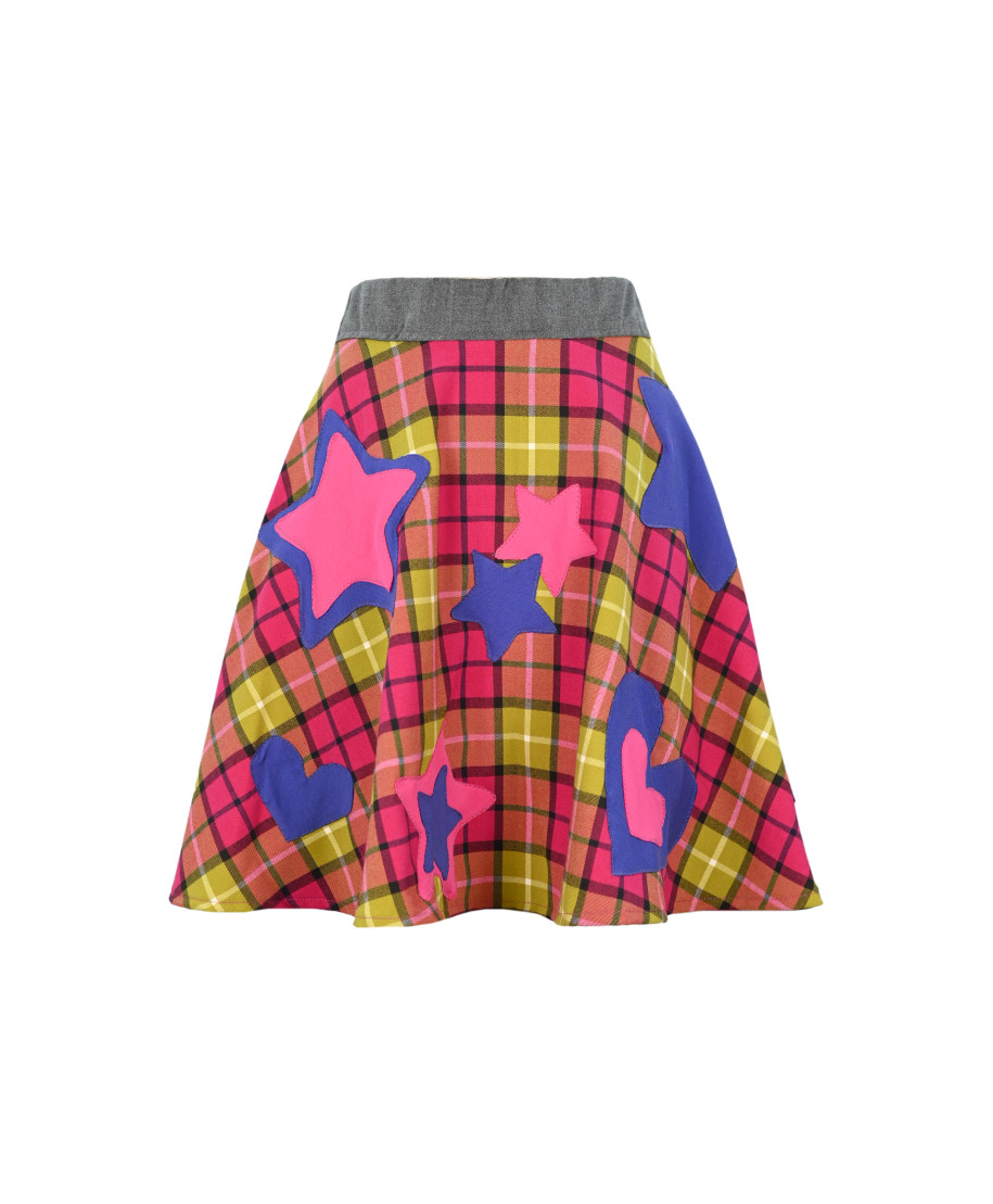 Gonna a ruota in tessuto tartan dai toni vivaci del fucsia, verde acido e giallo senape, caratterizzata da una cintura a fascia in vita in tessuto grigio melange a contrasto.