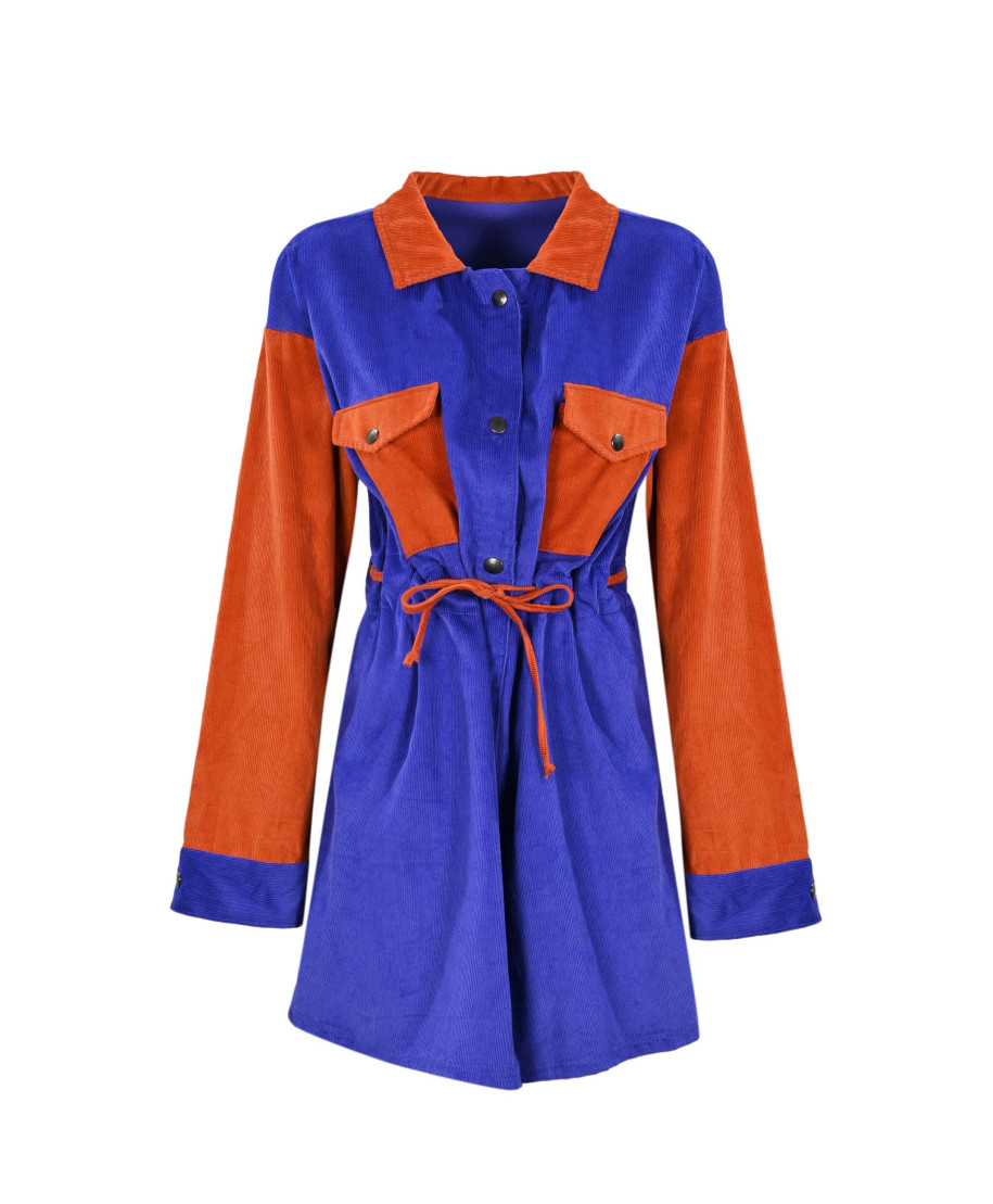 Camicia lunga bicolore in velluto a coste strette con tasche, abbottonatura centrale e coulisse regolabile.