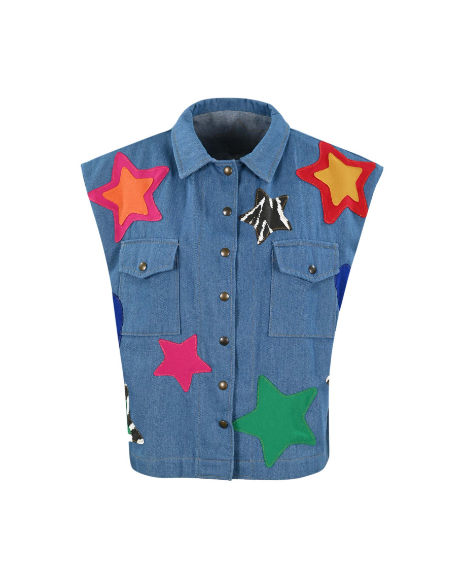 Camicia in denim dal carattere deciso e creativo, arricchita da applicazioni tagliate a mano singolarmente e cucite con cuciture a zig zag a vista, che ne esaltano l’artigianalità e lo spirito unico. Le stelle applicate, in varie dimensioni e fantasie, decorano sia il fronte che il retro del capo e in alcuni punti si sovrappongono tra loro, creando effetti di contrasto cromatico che donano movimento e personalità.