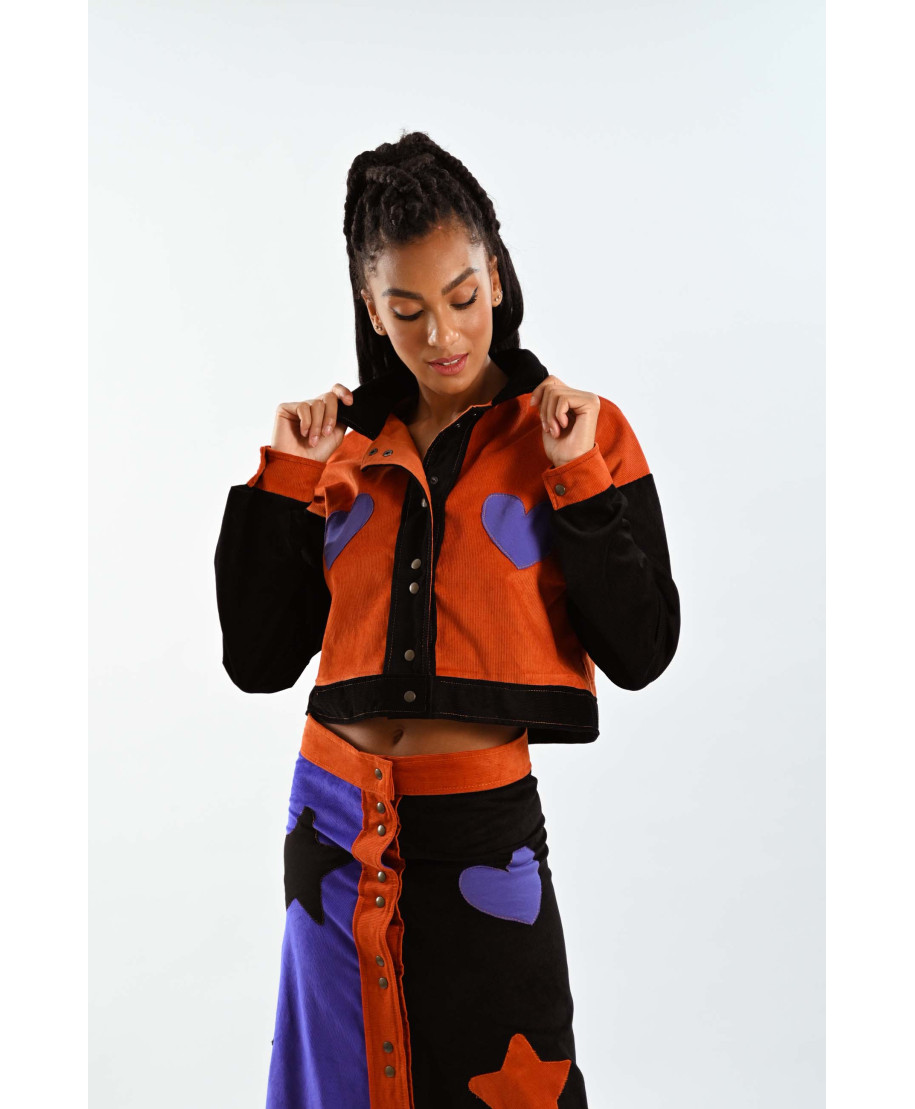 Giacca corta in velluto a coste strette dallo stile deciso e originale, realizzata in una combinazione bicolore: arancione ruggine per il corpo e nero per le maniche, la fascia inferiore, il colletto e l’abbottonatura centrale. Il colletto classico e i polsini a contrasto riprendono il tessuto del busto, creando un gioco cromatico armonioso e dinamico.