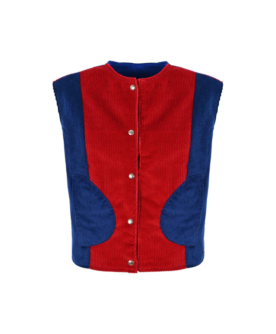 Gilet bicolore in velluto a coste larghe con tasche laterali, abbottonatura centrale e interno in tessuto.