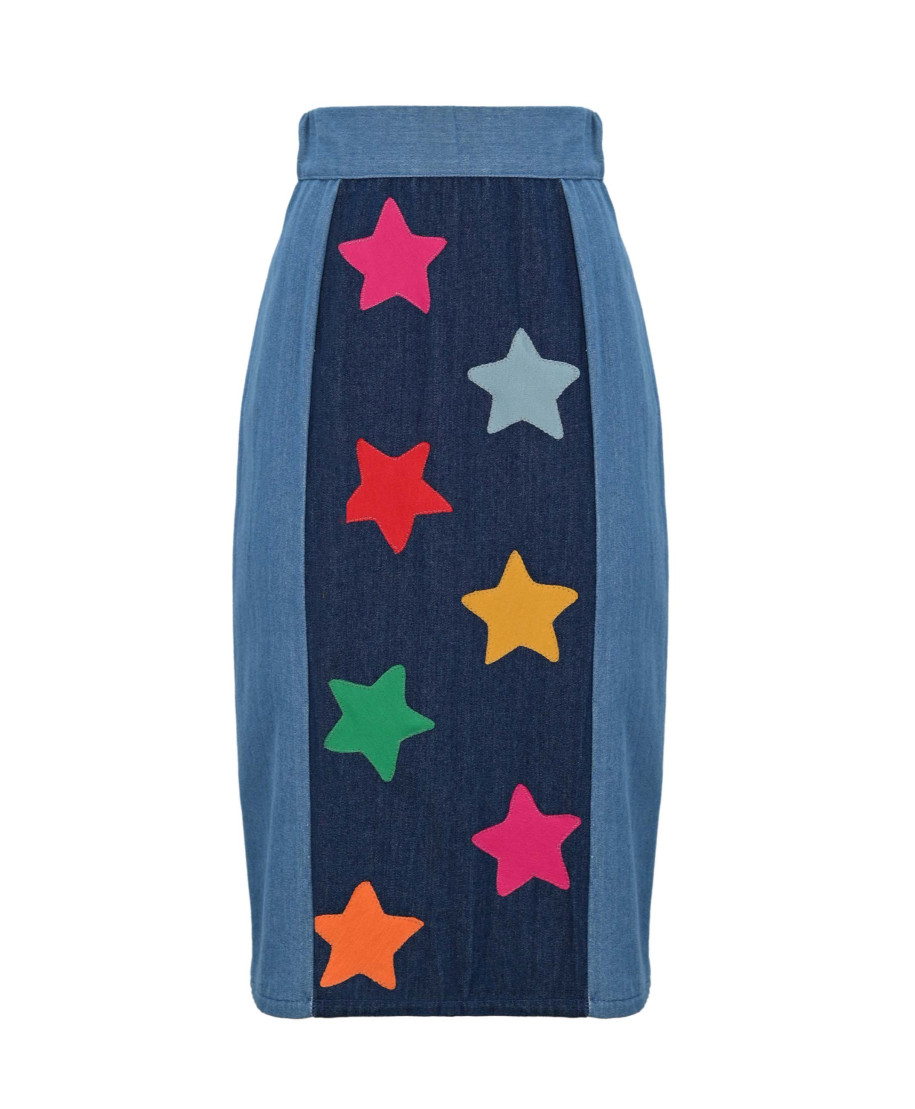 Gonna midi bicolore in denim, con pannello centrale in denim blu scuro e fianchi in denim chiaro a contrasto. La linea è dritta e slanciata, arricchita da stelle colorate tagliate a mano e applicate con cuciture a zig zag sul davanti, disposte in verticale per creare movimento visivo.