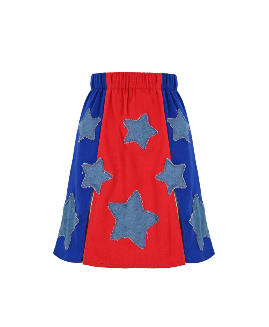 Mini gonna bicolore con quattro spacchi e stelle in denim tagliate a mano e appiccate con cuciture a zig zag.