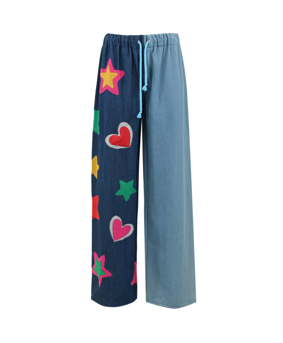 Pantalone a palazzo bicolore in denim, caratterizzato da una gamba ampia e comoda. La vita è elasticizzata e regolabile grazie a una coulisse con laccetto azzurro. Il lato destro del pantalone è decorato con applicazioni di cuori e stelle multicolore, tagliate a mano e rifinite con cuciture a zig zag, che donano un tocco giocoso e artigianale al capo. Il contrasto tra il denim chiaro e scuro accentua la particolarità del design, rendendolo unico e vivace.