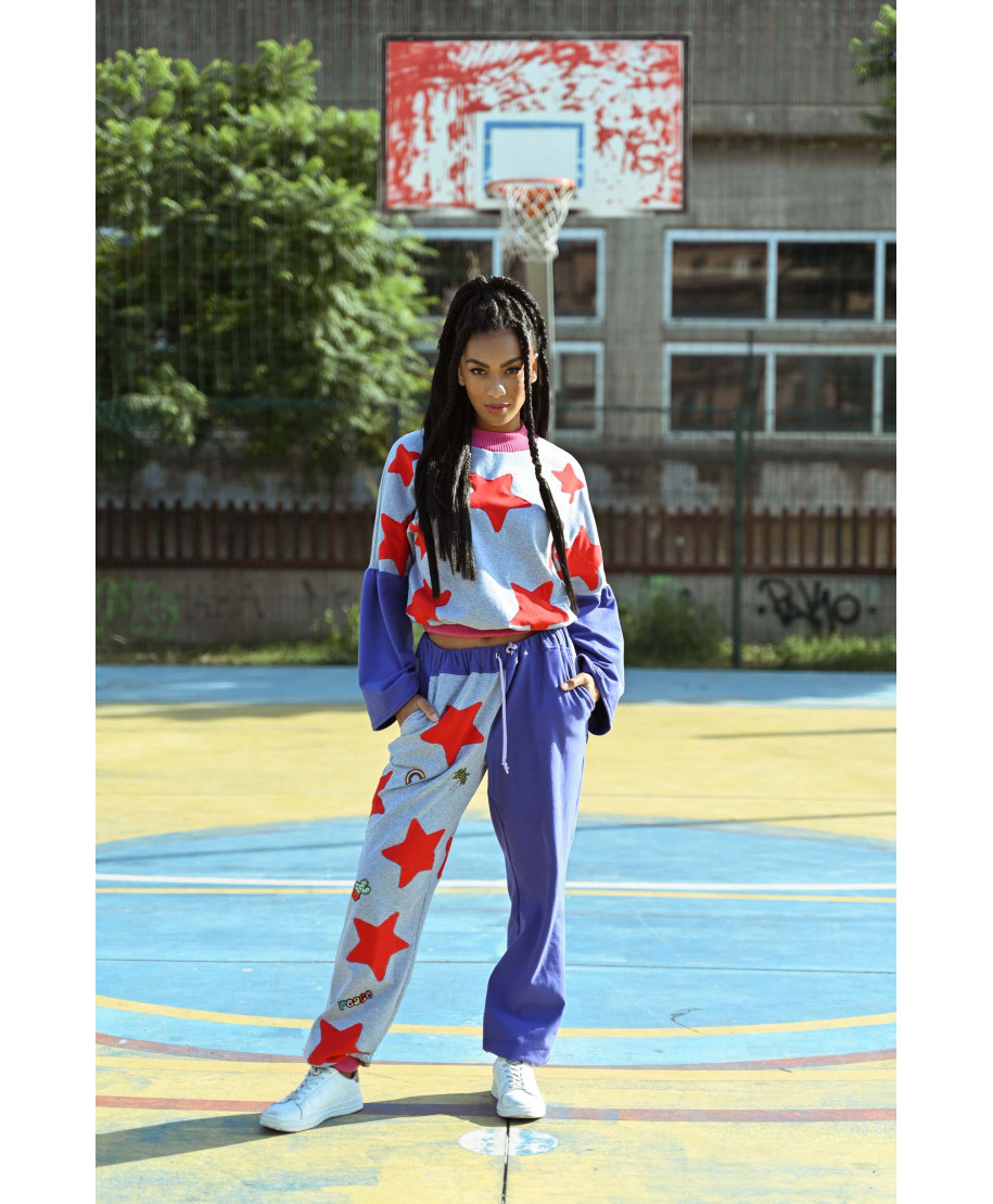 Pantalone jogger in felpa dallo stile giocoso e creativo, realizzato in un’accattivante combinazione bicolore: una gamba in grigio melange decorata e l’altra in blu acceso. Il modello presenta polsini a contrasto fucsia alle caviglie, comode tasche laterali e vita elasticizzata con coulisse regolabile in tono lilla, per un comfort personalizzato.