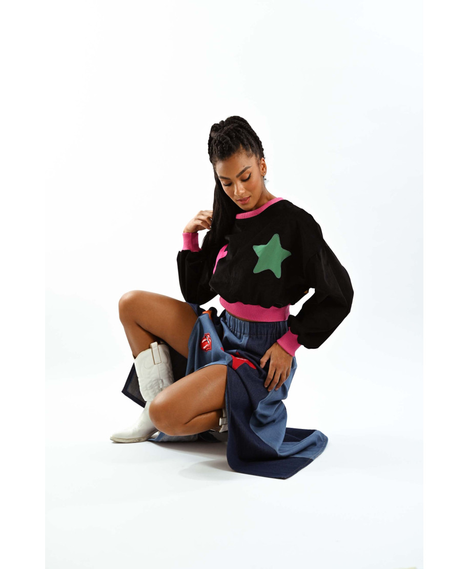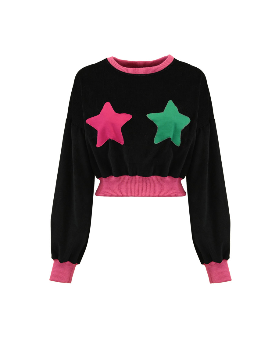 Felpa cropped in velluto a coste strette nero duca visconti di modrone , con vestibilità morbida e maniche lunghe. Il davanti è decorato con due stelle applicate: una rosa sul lato destro e una verde sul lato sinistro. Le stelle, realizzate a mano, sono fissate con cucitura a zig zag che ne evidenzia i contorni in modo artigianale e vivace.