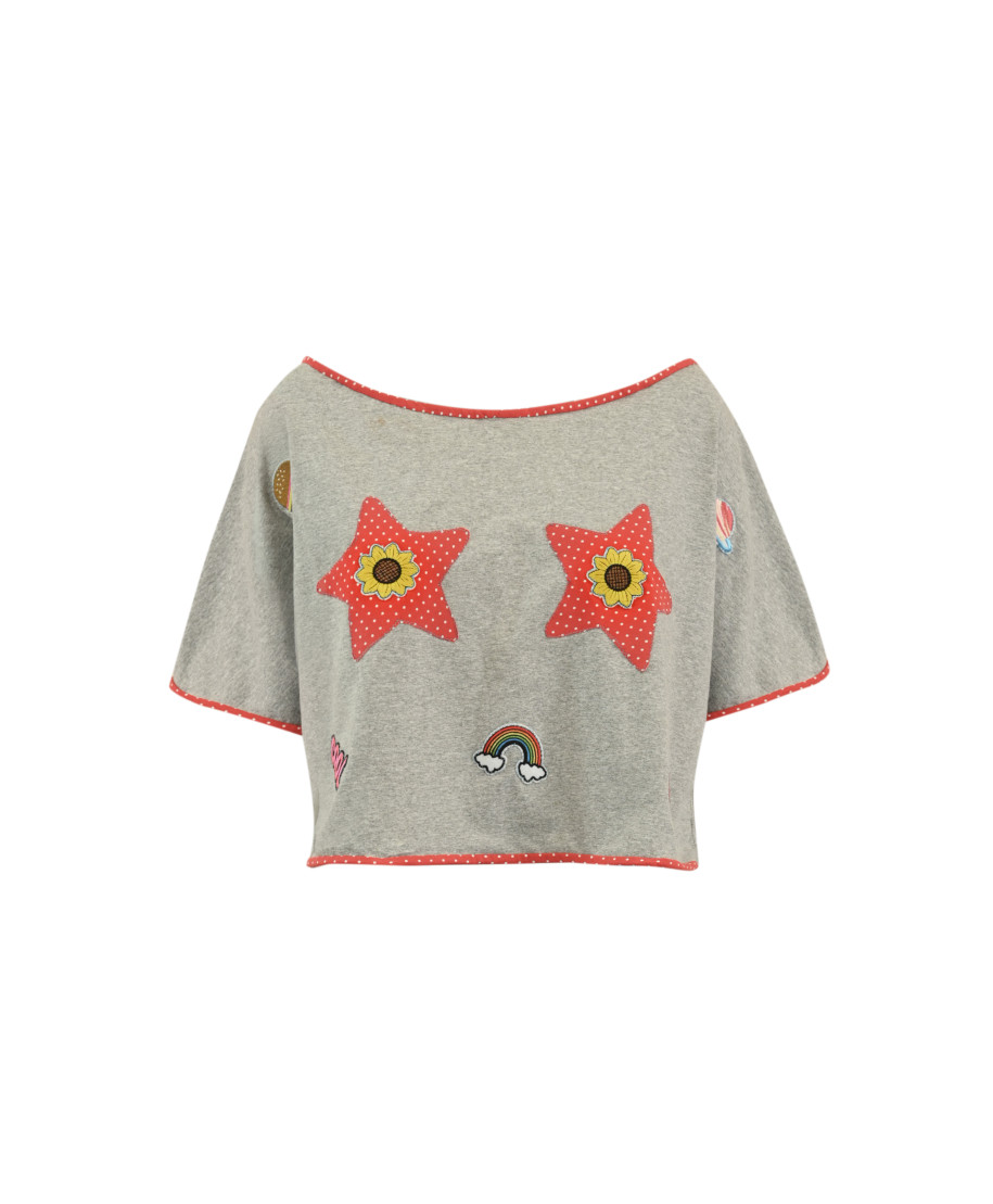 Crop top grigio con patch colorate e bordi rossi.